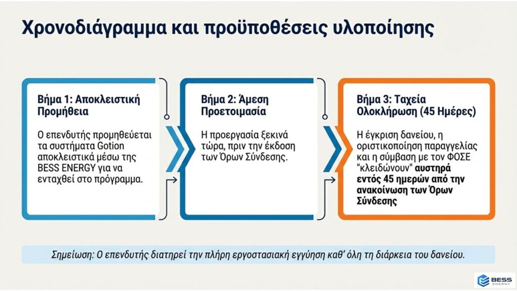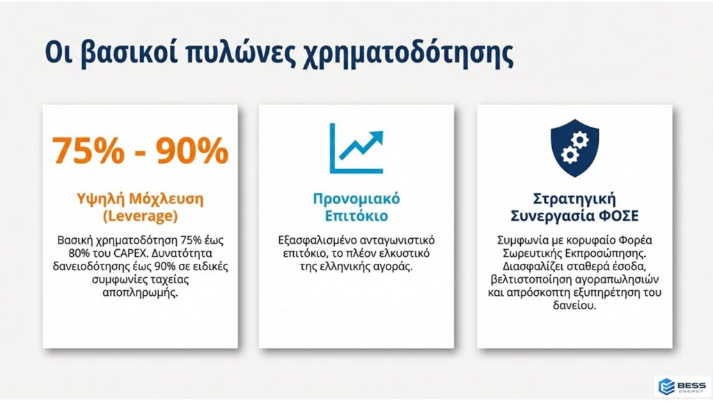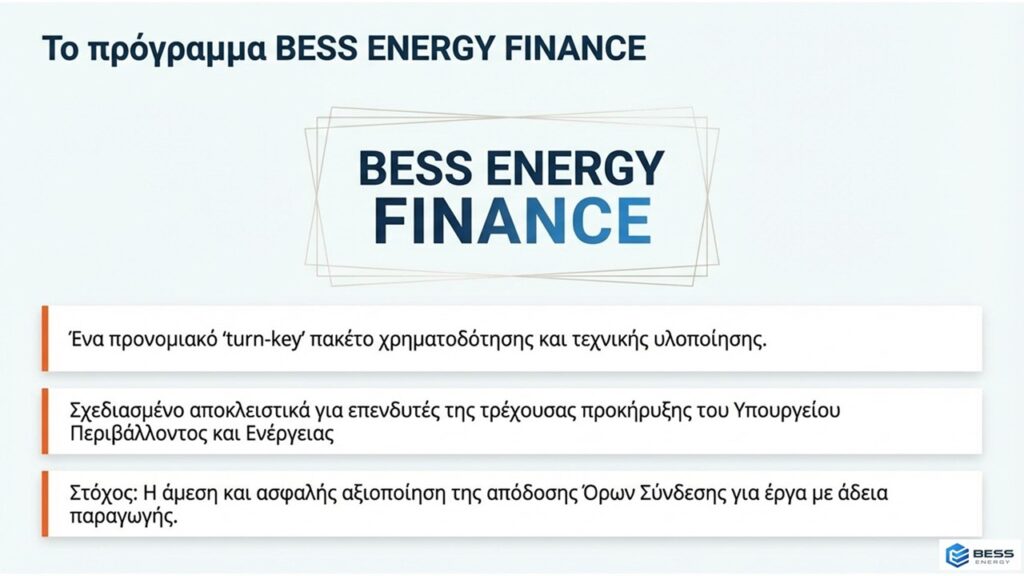 • BESS ENERGY FINANCE (75% έως 90% CAPEX): Με την εμπειρία της BESS ENERGY και την δύναμη της GOTION Κίνας μπορούμε και παρέχουμε δανειοδότηση που καλύπτει το 75%-80% της συνολικής επένδυσης (εξοπλισμός και EPC), με δυνατότητα να φτάσει έως και το 90% μέσω του αποκλειστικού μας πλάνου ταχείας αποπληρωμής. Η χρηματοδότηση προσφέρεται με το πλέον ανταγωνιστικό επιτόκιο της αγοράς, μέσω στρατηγικής συνεργασίας με κορυφαίο τραπεζικό ίδρυμα. Επισημαίνεται ότι θα τηρηθεί αυστηρή σειρά προτεραιότητας λόγω περιορισμένου προϋπολογισμού. Για κάθε έργο που θα ενταχθεί, εξασφαλίζουμε παράλληλα τη σύναψη PPA με όρους bankability.