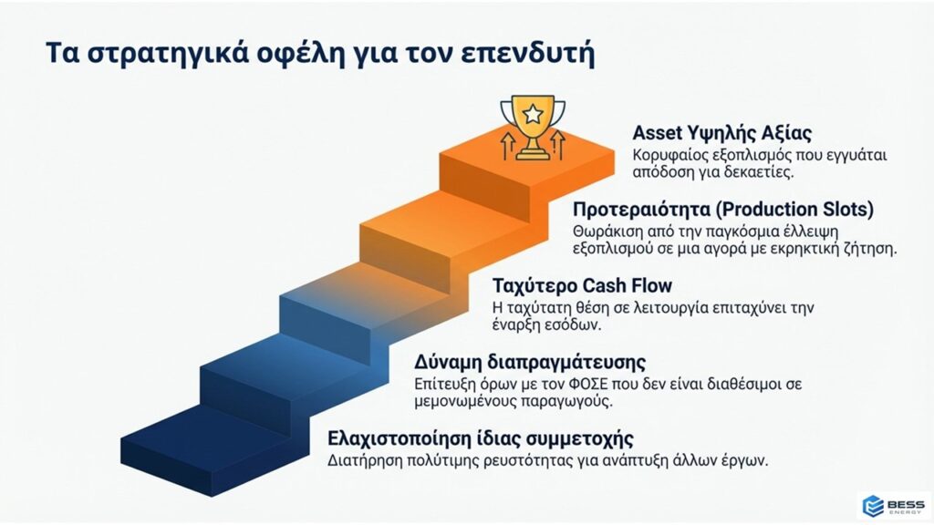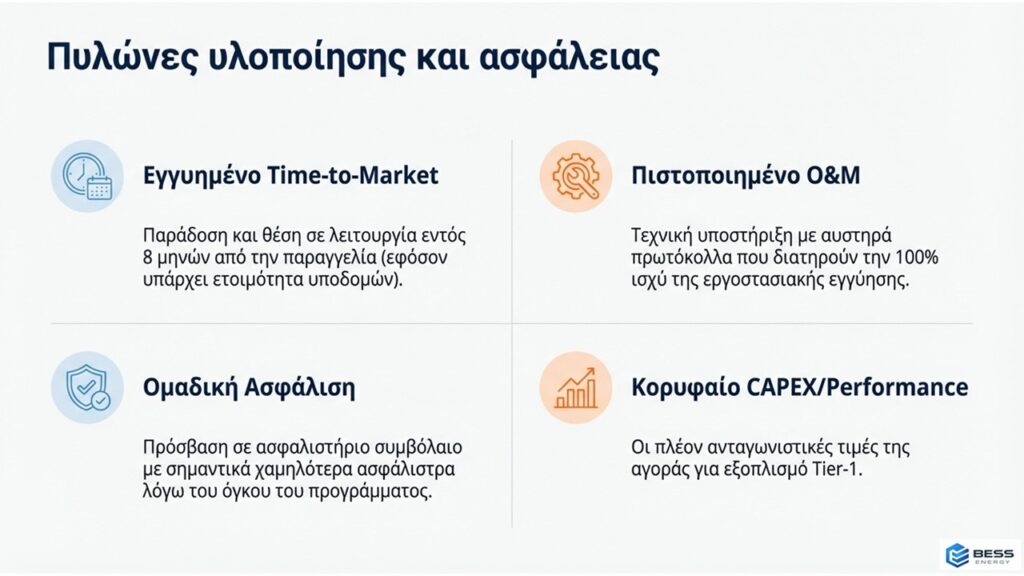 • Fast-Track υλοποίηση (έσοδα σε 8 μήνες): Με την παγκόσμια ζήτηση για μπαταρίες να προβλέπεται αυξημένη κατά 60% το 2026, η διαθεσιμότητα είναι πλέον κρίσιμος παράγοντας. Η Gotion Κίνας έχει δεσμεύσει συγκεκριμένα παραγωγικά slots για τα έργα της BESS ENERGY, τα οποία θα διατεθούν με αυστηρή σειρά προτεραιότητας. Δεσμευόμαστε για ένα χρονοδιάγραμμα με στόχο την έναρξη παραγωγής των μπαταριών σας εντός 30-45 ημερών από την ανακοίνωση των Όρων Σύνδεσης, ώστε σε 8 μήνες ο σταθμός σας να βρίσκεται σε πλήρη λειτουργία και να παράγει έσοδα.