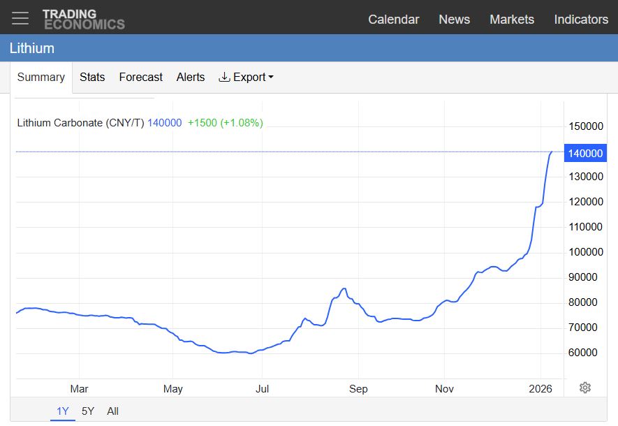 Η αγορά των πρώτων υλών για μπαταρίες βρίσκεται μπροστά σε μια σημαντική πρόκληση. Η τιμή του Ανθρακικού Λιθίου (Lithium Carbonate) σημείωσε κατακόρυφη άνοδο, ξεκινώντας από τα 80.000 CNY/ton τον Νοέμβριο και ξεπερνώντας ήδη τα 141.000 CNY/ton στις αρχές του 2026.
